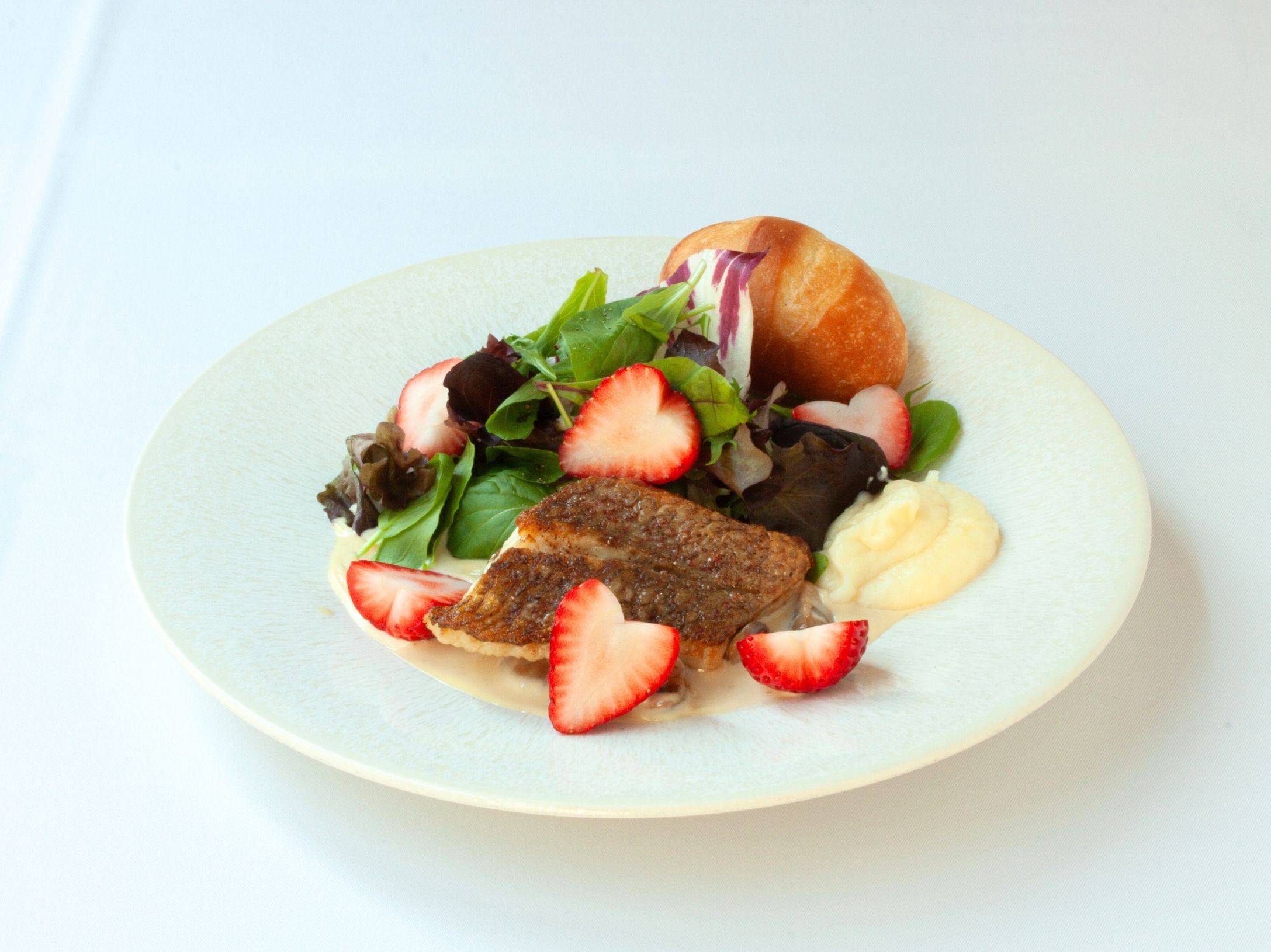真鯛のソテー と いちごのサラダ単品 2,200円(税込)フワッとソテーした真鯛にホワイトソースといちごサラダ合わせました。