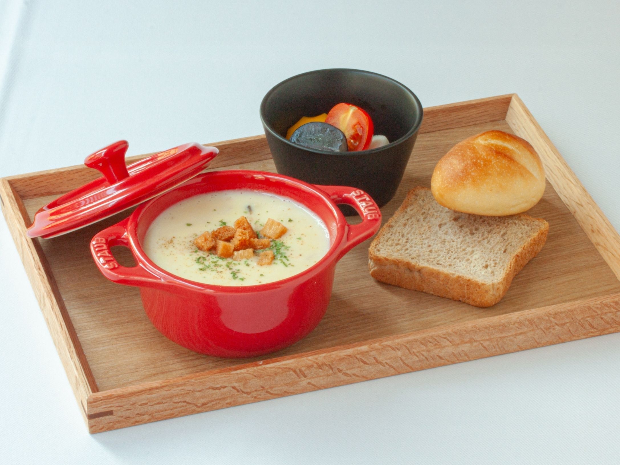 クラムチャウダー単品 1,760円(税込)あさりのうまみが凝縮されたクリーミーで濃厚なクラムチャウダー。パンとピクルスが付いたセットメニューです。 -