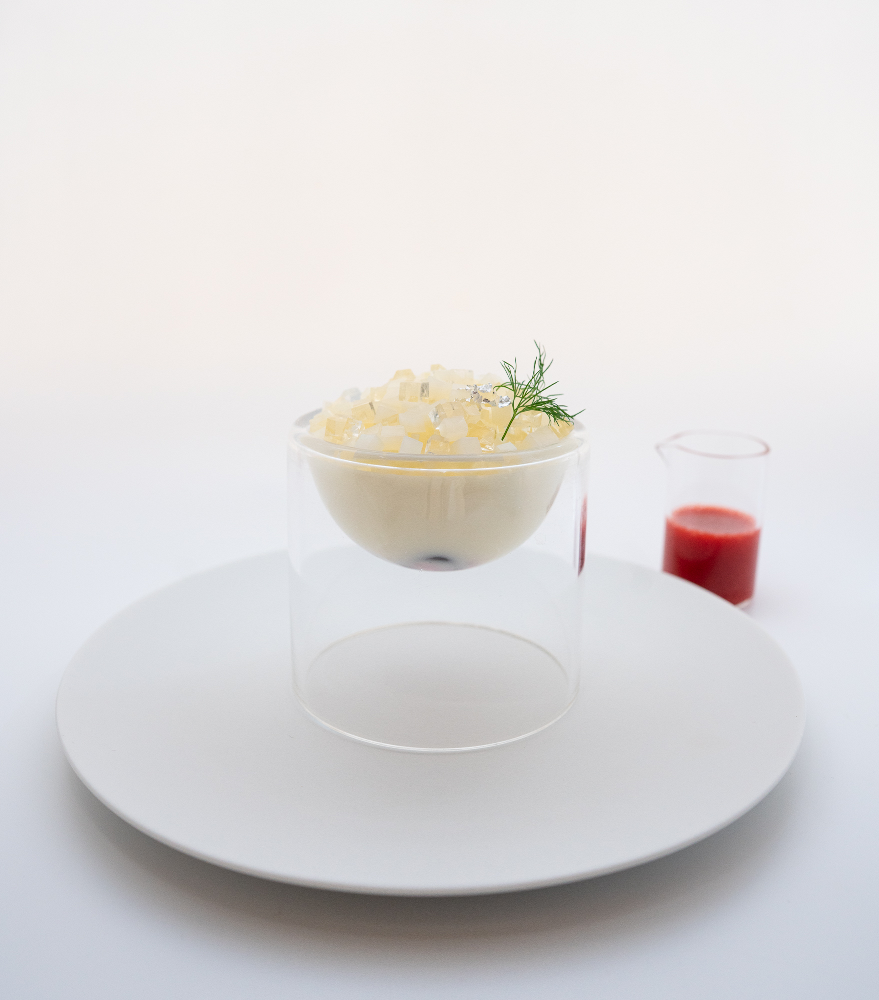 自家製のヨーグルトパンナコッタにダークチェリーのコンポートを沈め、