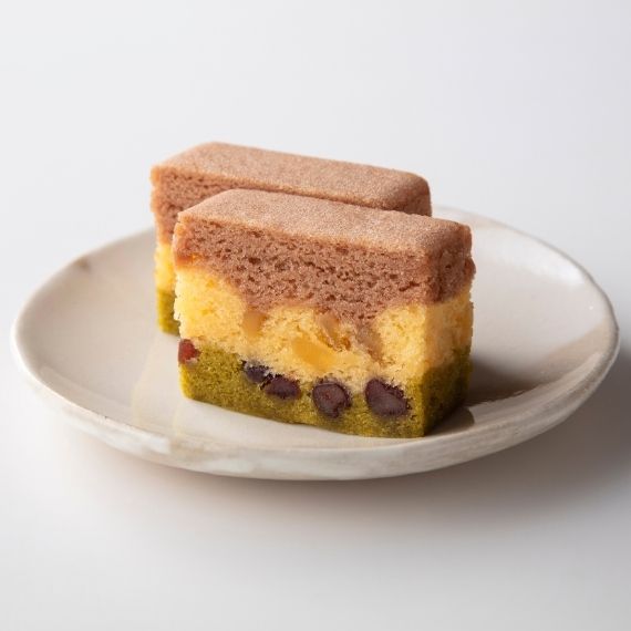 きざみ栗や大納言かのこ豆をちりばめた、色合い華やかな三層の蒸し菓子です。
